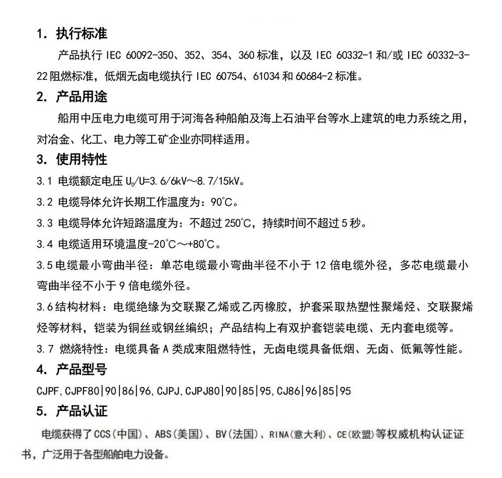 船用中压电力电缆可用于河海各种船舶及海上石油平台等水上建筑的电力系统之用,对冶金、化工、电力等工矿企业亦同样适用。