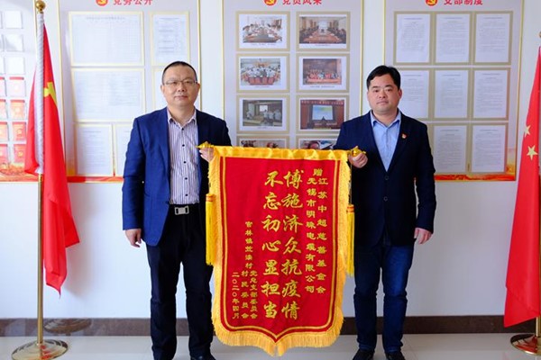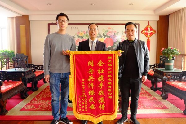 官林村、笠渎村村委分别向公司赠送锦旗以示感谢,公司董事长张乃明、总经理刘洪斌也向他们对企业的支持表示感谢,董事长张乃明说,守土护家是明珠人义不容辞的责任,疫情防控也容不得一丝马虎,明珠公司会继续加强与村委之间的联系,持续做好疫情防控,统筹抓好复工复产,助推高质量发展。