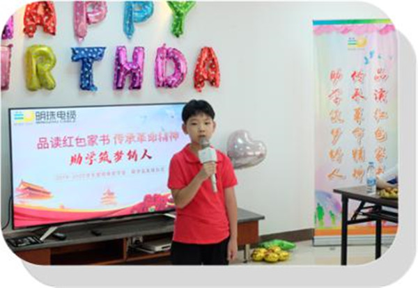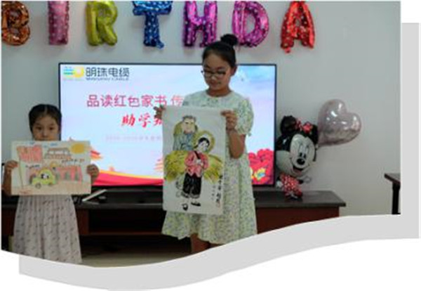 品读红色家书,传承革命精神,公司“三明读书会”的青年伙伴们与明珠学子一起观看宜兴籍烈士史砚芬写给弟弟、妹妹的诀别信,亲自诵读选取的红色家书,教会孩子们珍惜现有幸福生活,将革命先烈不怕牺牲、为取得革命胜利英勇斗争的精神传承和发扬光大。孩子们还进行了《千字文》背诵、绘画等才艺展示,并将现场绘画作品赠送给公司。