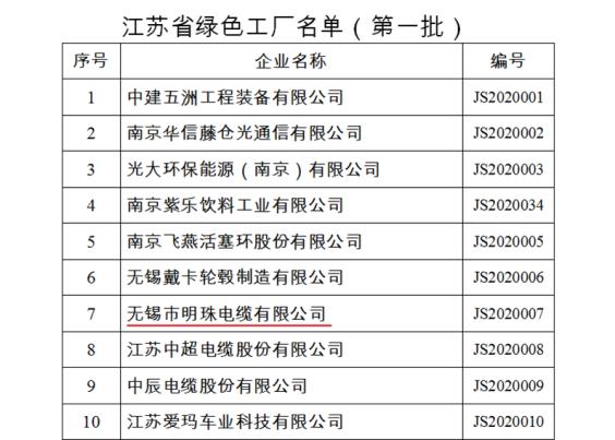 近日,江苏省工业和信息化厅正式公布第一批2020年江苏省绿色工厂名单,经过层层筛选、严格审核、第三方机构评价等环节,明珠电缆实力上榜,荣获江苏省“绿色工厂”荣誉。