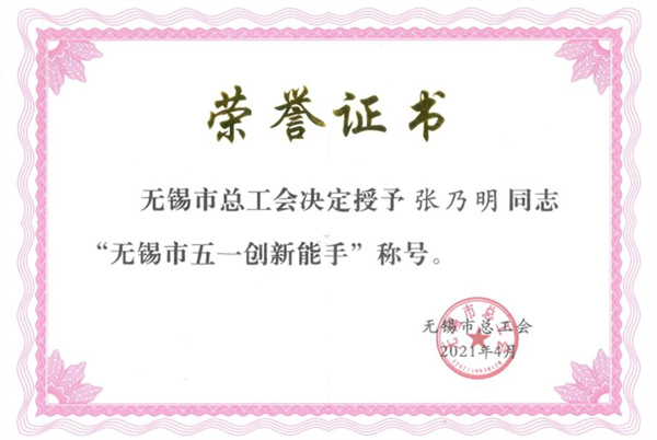 公司董事长张乃明荣获 无锡市五一创新能手荣誉称号