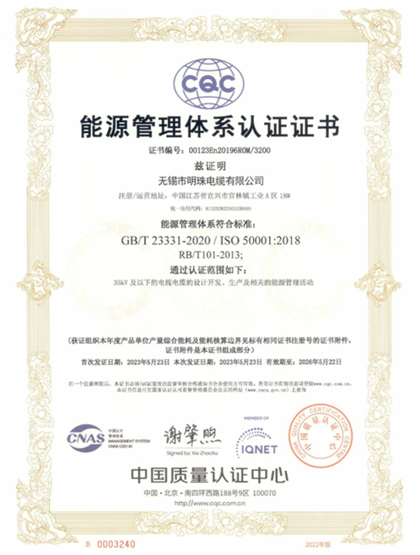 无锡市明珠电缆有限公司于今年5月初顺利通过能源管理体系审核,并取得证书。