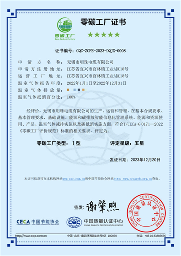 12月20日,“‘碳’寻新发展,角逐快车道”2023碳中和与绿色发展大会在北京举行,明珠公司获评全国电线电缆行业首批I型五星“零碳工厂认证”。