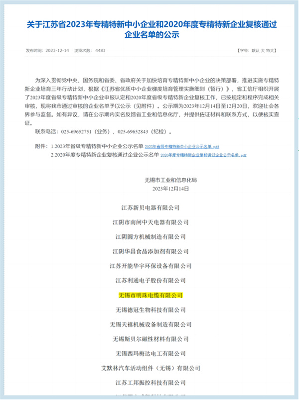 “专精特新”是指企业具备专业化、精细化、特色化和新颖化的特点。多年来,公司坚持科技创新,凭借“专业化、精细化、特色化、创新能力”特征和高质量的人才队伍建设等,深耕电缆领域26年,搭建“一站三中心”创新项目孵化载体,目前拥有国家专利近60项、省级高新技术产品20余项。